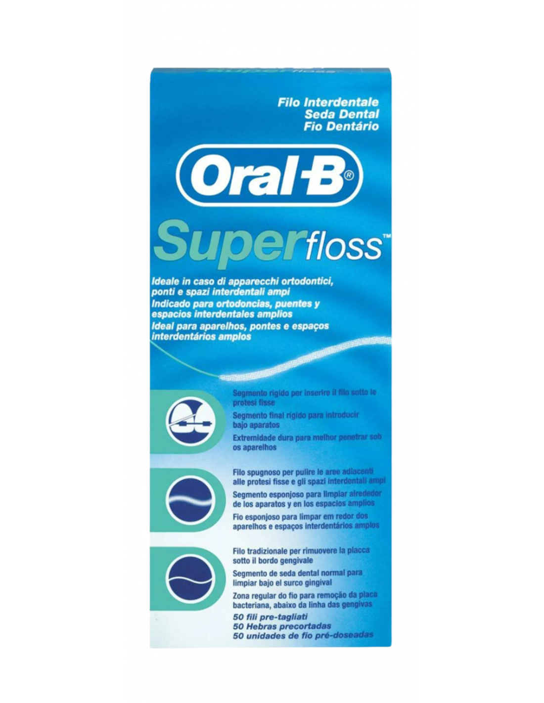 Facilita la inserción bajo puentes y ortodoncias.Los tres componentes únicos de Oral-B Super Floss, el extremo rígido, la porción esponjosa y la sección de seda standard, actúan conjuntamente para conseguir los máximos beneficios.