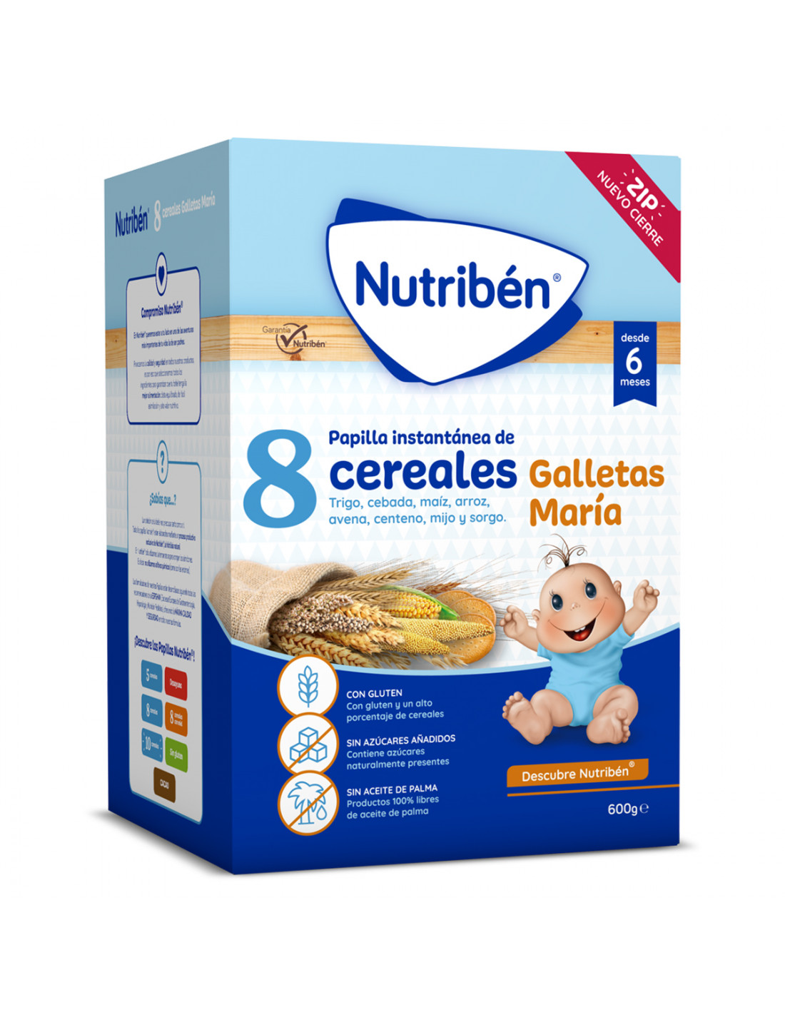 Esta papilla de cereales Nutribén® Galletas María le encantará a tu peque. Con una gran variedad de cereales y galletas María, le aporta energía y un sabor delicioso. Tu bebe podrá empezar a tomarla a partir de los 6 meses.